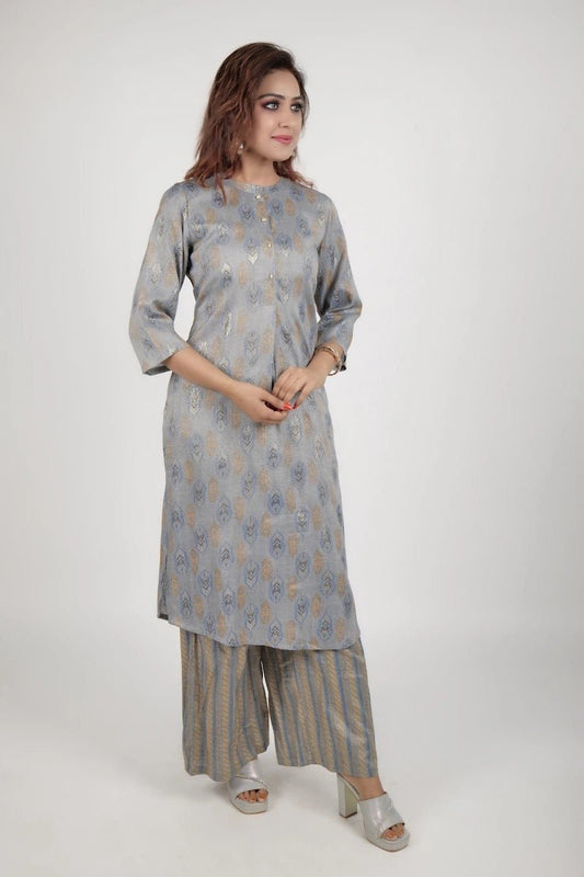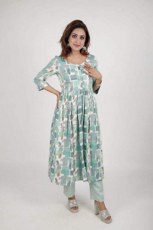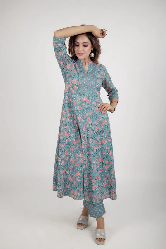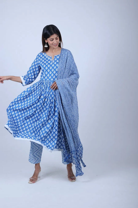 Blue Printed Anarkali Kurta Along With Printed Pants and Printed Dupatta